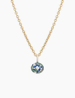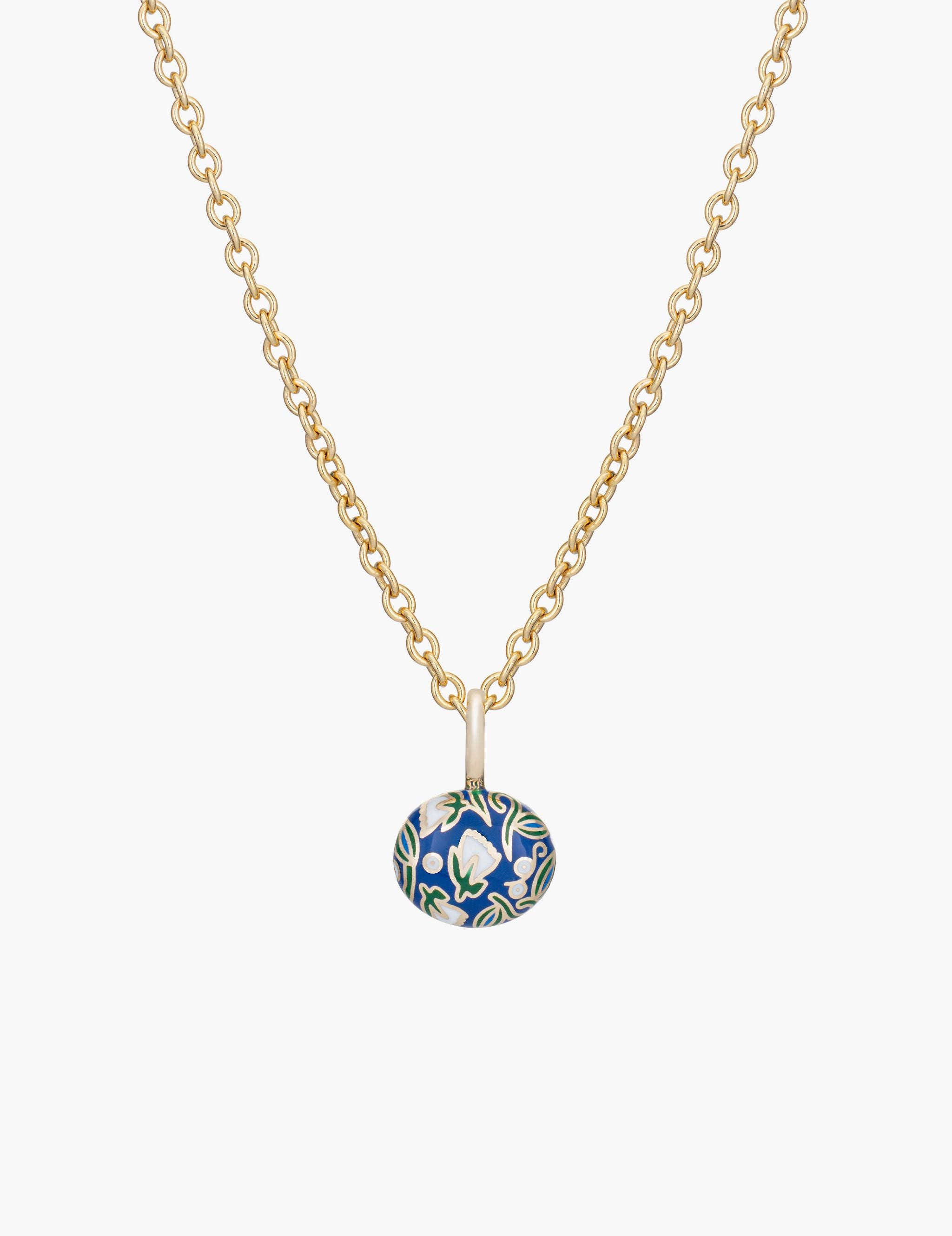 This 14k yellow gold pendant features an 1 ct oval emerald with cobalt enamel and tulip pattern. Pictured on our box chain and ovalette chain.
